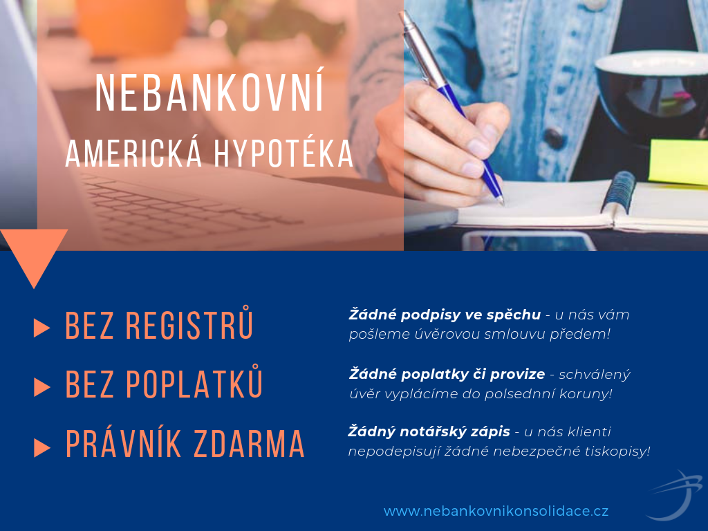 Americká hypotéka je úvěr neúčelový, to znamená, že nemusíte dokládat, na co poskytnuté peníze využijete. Můžete si tedy např. doplatit všechny nevýhodné půjčky, úvěry a předražené kreditní karty, zrekonstruovat vaší nemovitost, pořídit si nové vybavení vaší domácnosti či kanceláře, nastartovat vaše podnikání atd. Nabízíme americké hypotéky nebankovní, tzn. o úvěr u nás mohou žádat i zájemci, ke kterým se banky otočily zády. Neinkasujeme žádné nesmyslné poplatky! Více informací vč. nezávazné on-line žádosti najdete na našich webových stránkách.