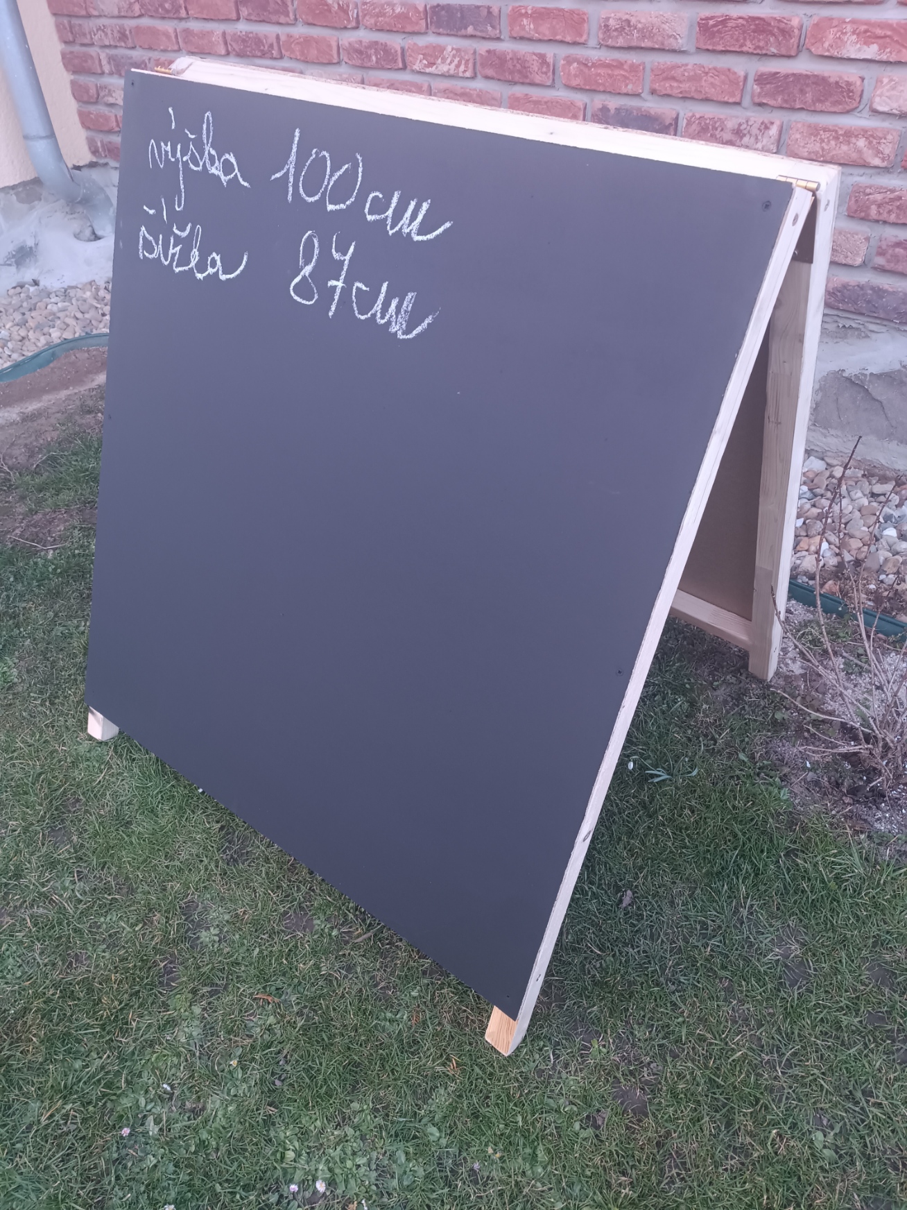 Reklamní cedule Ačko nabízím velká xxl reklamní cedule oboustranná možné psát fixou na tabule nebo také křídami. přírodní masivní dřevo v tomto rozměru máme poslední kus barevné provedení - píniová barva vše inox-nerez panty,šrouby,spony. váha okolo 12kg rozměry šíře 87 cm výška 100 cm šíře hranolu 4cmx4cm Cedule vhodná k podnikání -květinářství,cukrárna,řeznictví,bary,puby,ovoce zelenina a jiné. možné odeslat Českou poštou +360kč poštovné při platbě na učet nebo osobní předání Drásov Příbram ušetíte na poštovném v případě dotazu mi napište na mail.